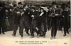 Dans les années 1910, les Camelots du roi se prennent brièvement d'amitié avec l’extrême gauche notamment les anarcho-syndicalistes[16]. Les militants des deux bords sympathisent en prison et se découvrent un ennemi commun : la République. Anarchistes et Camelots du roi partagent leur quotidien en détention et chantent ensemble aussi bien L'Internationale, La Chanson du linceul, Gloire au 17e, Vive Henri IV !, La France bouge ou encore Vive les Camelots du roi[17],[18]. À titre d'exemple, le Camelot du roi Georges Bernanos est arrêté le 14 janvier, le 8 février et le 10 mars 1909. Lors de sa dernière arrestation, il est condamné à dix jours de prison et 25 francs d'amende. Il raconte son incarcération et sa fraternisation avec les militants révolutionnaires :