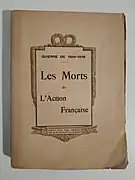 À l'issue de la Première Guerre mondiale, 10 des 12 secrétaires généraux et adjoints que comptèrent les Étudiants d'Action française entre 1909 et 1914 ont trouvé la mort au combat[38]. L'avocat et journaliste Jules Challamel recense pendant toute la durée du conflit les morts de l'Action française dans une rubrique intitulée « L'Action française au champ d'honneur » entre le [39] et le [40]. En novembre 1921, il publie Les Morts de l'Action française où il compile ses 1082 listes établies pendant la Grande Guerre[41]. L'Action française revendique deux mille cinq cents adhérents morts au champ d'honneur[42].
