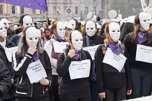 On estime à un minimum de 219 000 (soit 1 % de la population totale) le nombre de femmes victimes de violences conjugales de type physique ou sexuel[87] (dont 94 000 victimes de viol ou de tentatives de viol chaque année[88]) tous les ans en France. Dans 19 % des cas, ces violences sexuelles ou physiques sont suivies d'un dépôt de plainte. Les violences contre les femmes n'épargnent aucune génération ou nationalité, c'est d'ailleurs l'une des formes de violation des droits humains[89] les plus présentes[90].