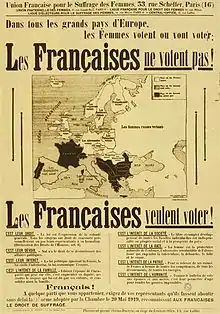 Alors que le chef de famille détenait la puissance paternelle et avait priorité dans la signature des contrats, les féministes obtiennent, par la loi du 18 février 1938, la suppression de la puissance maritale, de l'incapacité juridique de la femme mariée ainsi que de son devoir d'obéissance[87].