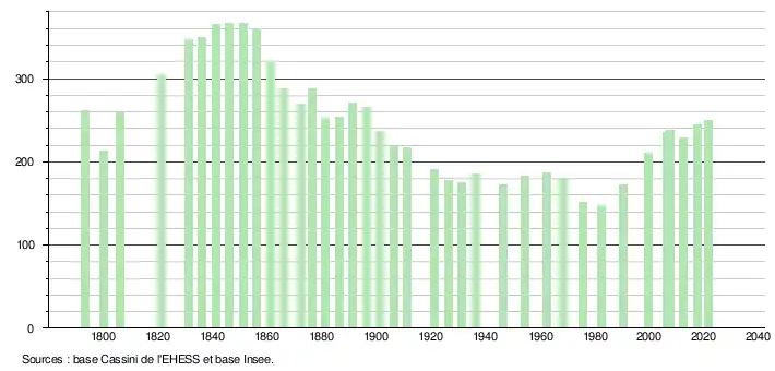 L'évolution du nombre d'habitants est connue à travers les recensements de la population effectués dans la commune depuis 1793. Pour les communes de moins de 10 000 habitants, une enquête de recensement portant sur toute la population est réalisée tous les cinq ans, les populations légales des années intermédiaires étant quant à elles estimées par interpolation ou extrapolation[27]. Pour la commune, le premier recensement exhaustif entrant dans le cadre du nouveau dispositif a été réalisé en 2007[28].