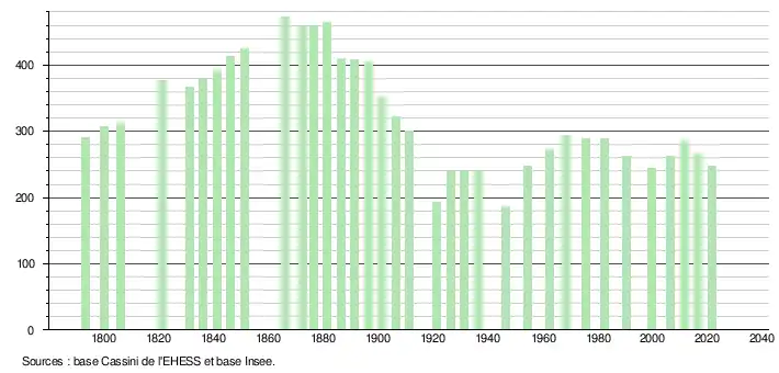 L'évolution du nombre d'habitants est connue à travers les recensements de la population effectués dans la commune depuis 1793. Pour les communes de moins de 10 000 habitants, une enquête de recensement portant sur toute la population est réalisée tous les cinq ans, les populations légales des années intermédiaires étant quant à elles estimées par interpolation ou extrapolation[19]. Pour la commune, le premier recensement exhaustif entrant dans le cadre du nouveau dispositif a été réalisé en 2006[20].