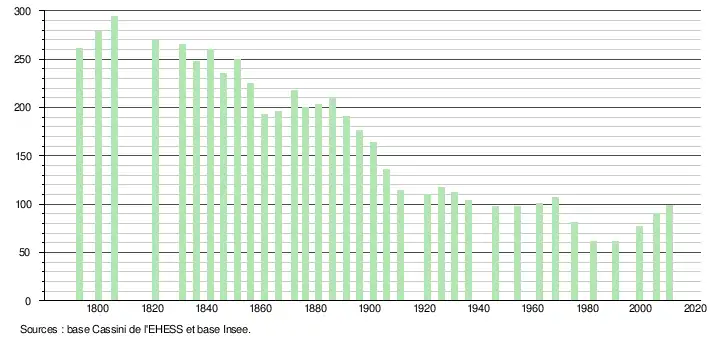 L'évolution du nombre d'habitants est connue à travers les recensements de la population effectués dans la commune depuis 1793. À partir du , les populations légales des communes sont publiées annuellement dans le cadre d'un recensement qui repose désormais sur une collecte d'information annuelle, concernant successivement tous les territoires communaux au cours d'une période de cinq ans. Pour les communes de moins de 10 000 habitants, une enquête de recensement portant sur toute la population est réalisée tous les cinq ans, les populations légales des années intermédiaires étant quant à elles estimées par interpolation ou extrapolation[4]. Pour la commune, le premier recensement exhaustif entrant dans le cadre du nouveau dispositif a été réalisé en 2005[5],[Note 1].
