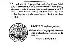 - Décret impérial qui établit une foire à Neuilly, Bulletin des lois no 40, série 6, Paris, Imprimerie nationale, août 1815, p. 290.