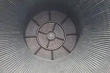 Moteur de production dont 1/4 est visible (F-6045). Ce moteur aurait dû voler sur la Saturn V (SA-511) pour Apollo 16. L'intégralité des moteurs de cette mission furent changés à la suite d'un incident lors de tests statiques.  |