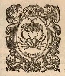 - Le crabe et le papillon. Une monnaie d'or datant du règne d'Auguste représente, au droit, la tête de l'empereur avec une couronne de laurier et, au revers, un crabe tenant dans ses pinces un papillon aux ailes éployées. Mais Waldemar Deonna[8] a montré que, dans l'Antiquité, le crabe n'était pas symbole de lenteur, ni le papillon symbole de hâte. Ce sont les humanistes de la Renaissance, amateurs d'emblèmes, qui ont vu dans ce motif une illustration de la devise d'Auguste ; Gabriel Simeoni[9] écrit : « L'Empereur Auguste, voulant monstrer comme il estoit tempéré et modeste en tous ses affaires... feit frapper entre plusieurs autres en une sienne médaille d'or un Papillon et un Escrevisse signifiant la vistesse par le Papillon et par l'Escrevisse la paresse, lesquelles deux choses sont un tempérament nécessaire à un Prince. » Ce motif a été utilisé comme marque par divers imprimeurs parisiens et lyonnais au XVIe siècle, avec la devise matura[10].