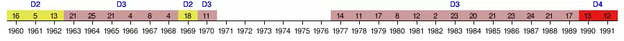 | 1993-1994 | 20e | 24 | 38 | 7 | 10 | 21 | 29 | 53 | -14 | Seizièmes de finale | |