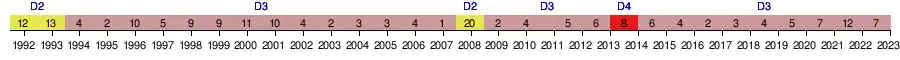 | 1982 | 12e | 25 | 28 | 9 | 7 | 12 | 29 | 32 | -3 | — | |