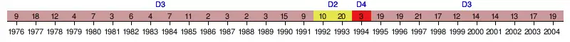 | 1974 | 3e Zone 4 | 16e | 35 | 40 | 14 | 7 | 19 | 33 | 48 | -15 | |