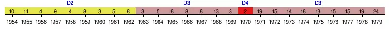 | 1971 | 3e Zone 4 | 19e | 30 | 38 | 9 | 12 | 17 | 27 | 48 | -21 | |