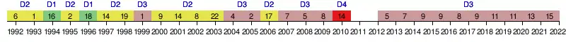 | 1989 | 14e | 40 | 42 | 14 | 12 | 16 | 46 | 42 | +4 | ||