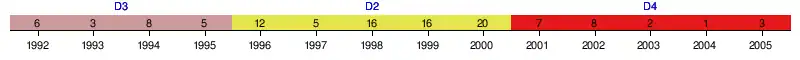 | 1994 | 3e Ouest | 8e | 47 | 40 | 19 | 9 | 12 | 53 | 35 | +18 | Premier tour |