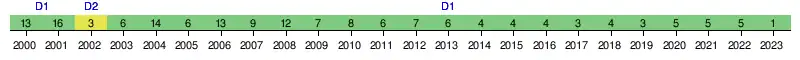 | 2002 | 2e | 3e | 42 | 24 | 13 | 3 | 8 | 37 | 28 | +9 | Seizièmes de finale |