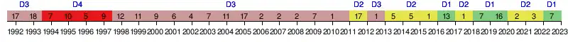 1995[22] 10e 29 26 8 5 13 30 42 -12 128es de finale