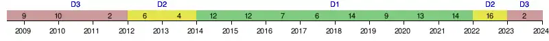 | 2015-2016 | 12e | 27 | 30 | 6 | 9 | 15 | 25 | 44 | -19 | Quarts de finale | |