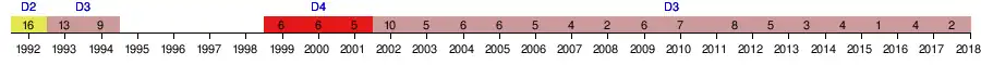 | 2000 | 6e | 17 | 14 | 4 | 5 | 5 | 13 | 16 | -3 | ||