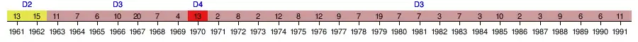 | 1961 | 2e Républiques 2 | 13e | 20 | 30 | 6 | 8 | 16 | 28 | 53 | -25 | — |