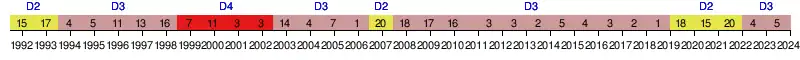 | 2003 | 3e Ouest | 14e | 41 | 36 | 11 | 8 | 16 | 30 | 36 | -6 | |
