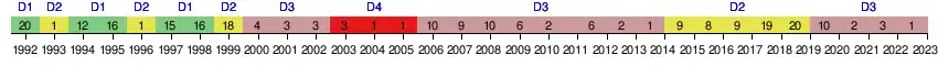 | 2004 | 1er | 69 | 28 | 22 | 3 | 3 | 80 | 23 | +57 | — | |
