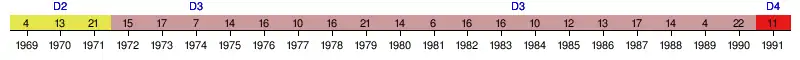 | 1970 | 2e | 13e | 39 | 42 | 14 | 11 | 17 | 38 | 45 | -7 | 32es de finale |
