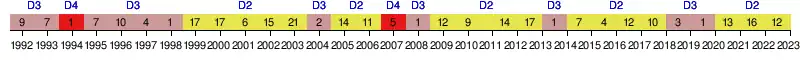 | 1995 | 3e Centre | 7e | 64 | 40 | 19 | 7 | 14 | 48 | 41 | +7 | 128es de finale |