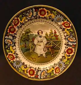 ![]() Assiette en faïence fine à décor historique imprimé et peint, signée Charles Hamlet, faïence de Creil-Montereau vers 1876-1884. Musée Gallé-Juillet de Creil. |