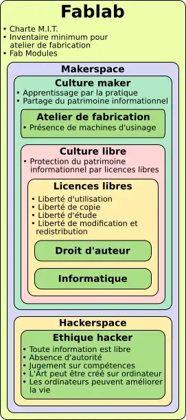 C'est ainsi que l'on retrouve dans les fab labs beaucoup de préceptes provenant directement de l'éthique hacker et des valeurs de la culture maker[11].