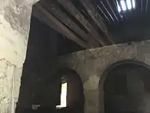 Zoom de la précédente vue. On apercevoit sur la gauche du bâtiment la toiture endommagée d’avant la restauration.