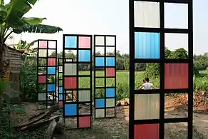 Face à l’eau est une installation située dans une aire de passage sur les berges du fleuve Wouri à Bonamouti. Elle est constituée de cinq panneaux verticaux, en bois, métal et tôles plastiques colorés. Erigés à 3,70 m de hauteur pour les plus importants, ces cinq ‘volets’ désolidarisés sont disposés sur la berge de façon qu’à une certaine distance, ils créent l’illusion d’un paravent unique. L’installation est conçue dans l’optique de protéger des regards des promeneurs la nudité des piroguiers-pêcheurs qui se lavent à l’issue de leur journée de travail.