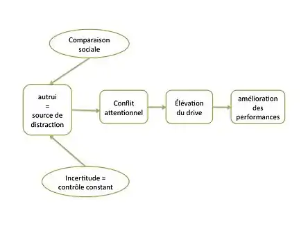 - une source d'information de comparaison sociale. Festinger[9] décrit, en 1954, le processus de comparaison sociale qui peut être une des raisons principales qui font d'autrui une source de distraction : les sujets, face à une nouvelle tâche, procèderaient par comparaison sociale à une analyse du coacteur de la tâche. Non directement liée à la tâche en tant que telle et à sa réalisation, cette activité de comparaison entrainerait alors un conflit attentionnel entre la recherche d'informations nécessaires à la comparaison et l'exécution de la tâche en elle-même.
