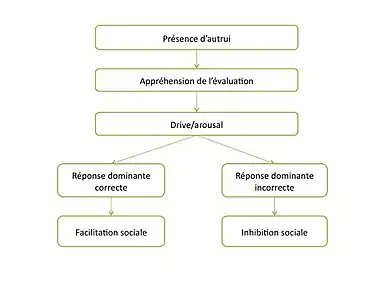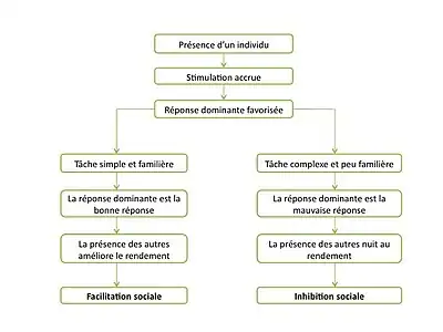 Cependant, la seule motivation n'entraîne pas automatiquement une amélioration de la performance. En effet, comme expliqué dans la théorie de Zajonc, cela dépendra de la maîtrise du sujet par rapport à la tâche (réponse dominante correcte ou incorrecte), ce qui entrainera un effet soit de facilitation sociale, soit d'inhibition sociale (voir schéma).