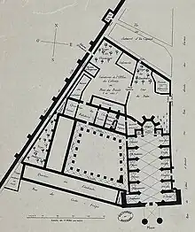 Jusqu'au début du XIVe siècle, l'université de médecine n'occupe aucun bâtiment propre. Les cours sont dispensés le matin au domicile des maîtres, consistant dans la lecture et l’interprétation des textes anciens, dont le maître possédait une copie[30]. L'après-midi, maître et étudiants se rendaient chez les patients pour la pratique et l'enseignement de la médecine "au lit du malade". Concernant les actes de l'Université (débats autour de différents thèmes que l'on appelaient les "disputes", passage des examens, soutenance de diplômes, assemblée de l'Université…), ceux-ci étaient réalisés dans les églises de la ville (Saint-Firmin qui avait en outre la charge d'archiver tous les actes de l'Université médicale, Notre Dame des Tables, ou encore la Salle L’Évêque, résidence montpelliéraine de l’Évêque de Maguelone). En 1340, l'université crée un cours officiel d'anatomie sur cadavre[31], l'un des plus précoces de l'histoire universitaire, qui en fera sa renommée[32]. Les années 1360 voient la construction des tout premiers bâtiments universitaires de la ville, œuvre du Pape Urbain V : collège des douze médecins (ou collège de Mende, encore appelé collège du Pape, rue Alexandre Germain[33],[34]) et collège Saint Benoît Saint Germain (initialement prévu pour les étudiants en droit et en théologie, puis palais épiscopal en 1536, et enfin bâtiment historique de la faculté de médecine depuis 1795[34],[35]). Le collège Saint Benoît était associé à un monastère bénédictin et était doté d'une abbatiale à la silhouette fort remarquable (4 tours carrées précédées d'un porche muni de 2 piliers cylindriques)[34],[35], qui était au Moyen Âge l'"église universitaire"[36] de tous les étudiants de Montpellier (actuelle Cathédrale Saint Pierre).
