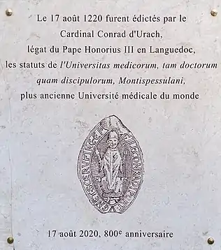La faculté de médecine de Montpellier, créée en 1220, est la plus ancienne université du Monde en ce qui concerne la médecine[1],[2],[3],[4],[5],[6],[7], au sens juridique et conceptuel du terme « université » tel que défini à partir du XIIIe siècle en Europe[1], au même titre que les universités de Paris, Oxford et Bologne le sont pour la théologie, les arts libéraux (Paris) et le droit (Oxford et Bologne). Elle a fêté ses 800 ans tout au long de l'année 2020 et 2021[8] et a fait l'objet d'une édition d'un timbre poste commémoratif national[9].