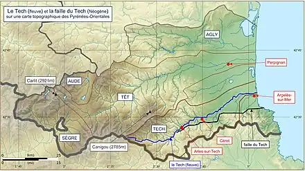 Carte topographique du Tech et de la faille du Tech (Néogène).