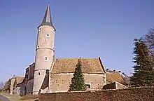 La tour de trois niveaux, ouverte par un portail à linteau cintré est datée de 1754.