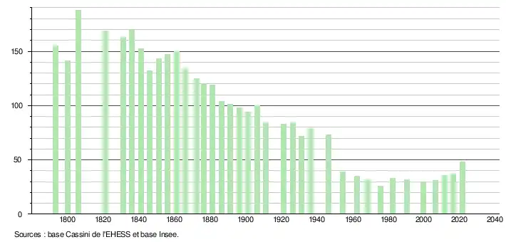L'évolution du nombre d'habitants est connue à travers les recensements de la population effectués dans la commune depuis 1793. Pour les communes de moins de 10 000 habitants, une enquête de recensement portant sur toute la population est réalisée tous les cinq ans, les populations légales des années intermédiaires étant quant à elles estimées par interpolation ou extrapolation[28]. Pour la commune, le premier recensement exhaustif entrant dans le cadre du nouveau dispositif a été réalisé en 2006[29].