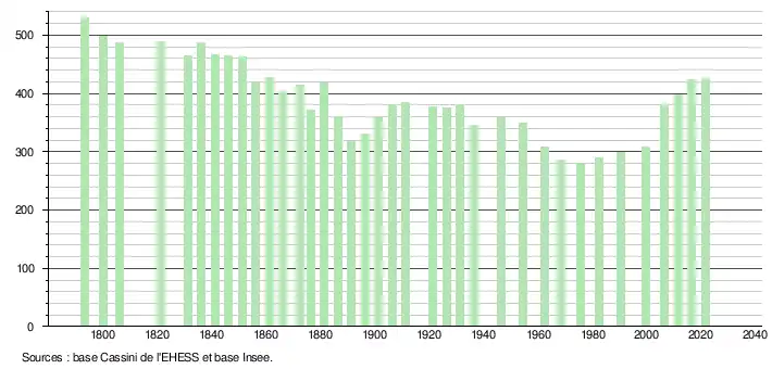 | L'évolution du nombre d'habitants est connue à travers les recensements de la population effectués dans la commune depuis 1793. Pour les communes de moins de 10 000 habitants, une enquête de recensement portant sur toute la population est réalisée tous les cinq ans, les populations légales des années intermédiaires étant quant à elles estimées par interpolation ou extrapolation[23]. Pour la commune, le premier recensement exhaustif entrant dans le cadre du nouveau dispositif a été réalisé en 2006[24]. En 2021, la commune comptait 426 habitants[Note 3], en augmentation de 3,4 % par rapport à 2015 (Gironde : +6,88 %, France hors Mayotte : +1,84 %). |