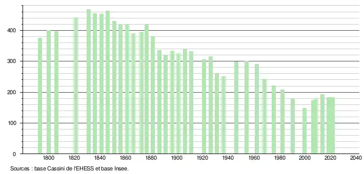 L'évolution du nombre d'habitants est connue à travers les recensements de la population effectués dans la commune depuis 1793. Pour les communes de moins de 10 000 habitants, une enquête de recensement portant sur toute la population est réalisée tous les cinq ans, les populations légales des années intermédiaires étant quant à elles estimées par interpolation ou extrapolation[30]. Pour la commune, le premier recensement exhaustif entrant dans le cadre du nouveau dispositif a été réalisé en 2008[31].