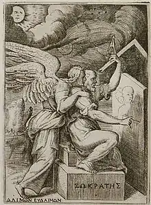 Socrate nomme daimonion (de δαιμόνιον / daimonion) une sorte de génie personnel qui lui souffle ses réponses lorsqu'il s'exprime sur un sujet. Ce génie personnel lui suggérait ses résolutions, et surtout ce qu'il ne devait pas faire[5]. Ce daïmon lui aurait ainsi conseillé, un jour, de ne pas emprunter une certaine route. Le philosophe suivit son conseil tandis que ses compagnons restèrent. Un peu plus tard, ils furent bloqués par un troupeau de porcs et arrivèrent couverts de boue[6].