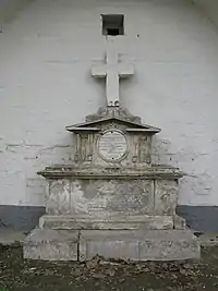 Les supports représentent une feuille azur, elle-même terminée par une feuille d'or. Au centre un écu divisé en deux parties : la partie senestre sur fond or représente un demi-aigle sable, il est coiffé d'une couronne or, emprisonné dans ses serres un orbe. Dans la partie dextre sur fond azur, sortant d'un nuage un bras protégé d'un canon d'arrière-bras, d'une cubitière et d'un canon d'avant-bras argent dont la main nue tient une épée argent. Cet écu est surmonté d'un heaume couronné, un lambrequin azur et or entoure l'écu.