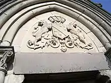 Selon René de Belleval[4], ces armes sont « De sable à la bande d'or, accompagnée de huit billettes de même ». Supports et cimier « Trois lions ".