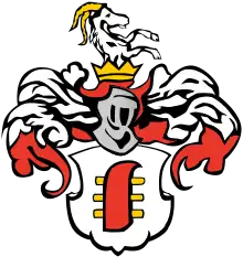 Blasonnement des armoiries : "D'argent à une échelle d'assaut (de) rouge avec trois croisillons d'or. Sur le casque rouge et argenté à pareilles lambrequins, un bouquetin (de) d'argent en croissance et armé d'or".