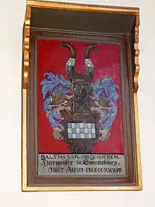 Le blason principal montre en or une barre rasée de bleu et d'argent. Deux cornes de buffle, inscrites comme l'écu, sur le casque aux lambrequins bleus et or.