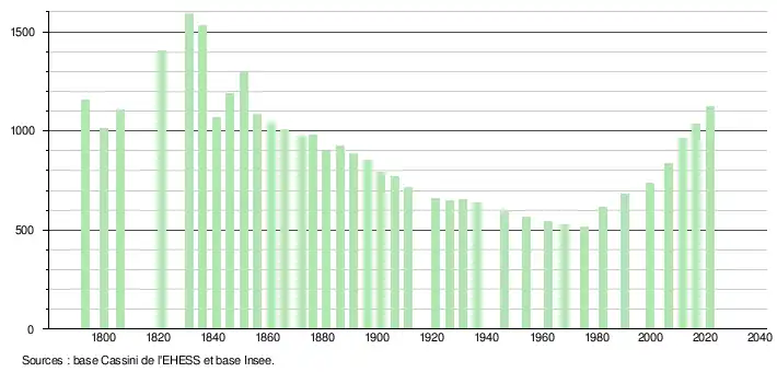 L'évolution du nombre d'habitants est connue à travers les recensements de la population effectués dans la commune depuis 1793. Pour les communes de moins de 10 000 habitants, une enquête de recensement portant sur toute la population est réalisée tous les cinq ans, les populations légales des années intermédiaires étant quant à elles estimées par interpolation ou extrapolation[21]. Pour la commune, le premier recensement exhaustif entrant dans le cadre du nouveau dispositif a été réalisé en 2006[22].
