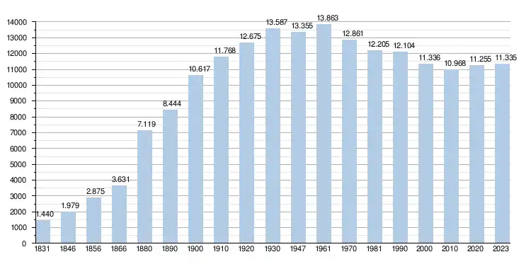 Les chiffres des années 1831 à 1970 tiennent compte des chiffres des anciennes communes fusionnées.