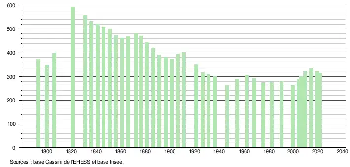 L'évolution du nombre d'habitants est connue à travers les recensements de la population effectués dans la commune depuis 1793. Pour les communes de moins de 10 000 habitants, une enquête de recensement portant sur toute la population est réalisée tous les cinq ans, les populations légales des années intermédiaires étant quant à elles estimées par interpolation ou extrapolation[22]. Pour la commune, le premier recensement exhaustif entrant dans le cadre du nouveau dispositif a été réalisé en 2004[23].