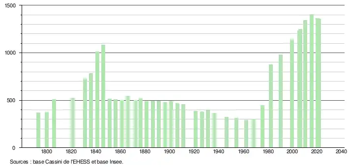 L'évolution du nombre d'habitants est connue à travers les recensements de la population effectués dans la commune depuis 1793. Pour les communes de moins de 10 000 habitants, une enquête de recensement portant sur toute la population est réalisée tous les cinq ans, les populations légales des années intermédiaires étant quant à elles estimées par interpolation ou extrapolation[21]. Pour la commune, le premier recensement exhaustif entrant dans le cadre du nouveau dispositif a été réalisé en 2005[22].