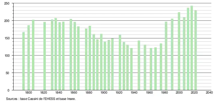 L'évolution du nombre d'habitants est connue à travers les recensements de la population effectués dans la commune depuis 1793. Pour les communes de moins de 10 000 habitants, une enquête de recensement portant sur toute la population est réalisée tous les cinq ans, les populations légales des années intermédiaires étant quant à elles estimées par interpolation ou extrapolation[17]. Pour la commune, le premier recensement exhaustif entrant dans le cadre du nouveau dispositif a été réalisé en 2006[18].