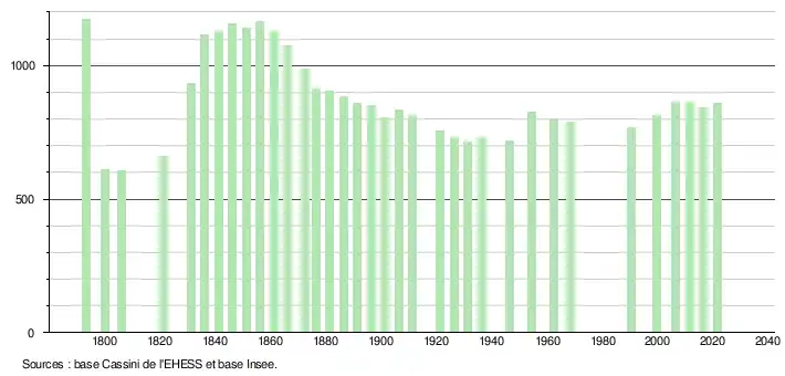 L'évolution du nombre d'habitants est connue à travers les recensements de la population effectués dans la commune depuis 1793. Pour les communes de moins de 10 000 habitants, une enquête de recensement portant sur toute la population est réalisée tous les cinq ans, les populations légales des années intermédiaires étant quant à elles estimées par interpolation ou extrapolation[30]. Pour la commune, le premier recensement exhaustif entrant dans le cadre du nouveau dispositif a été réalisé en 2006[31].