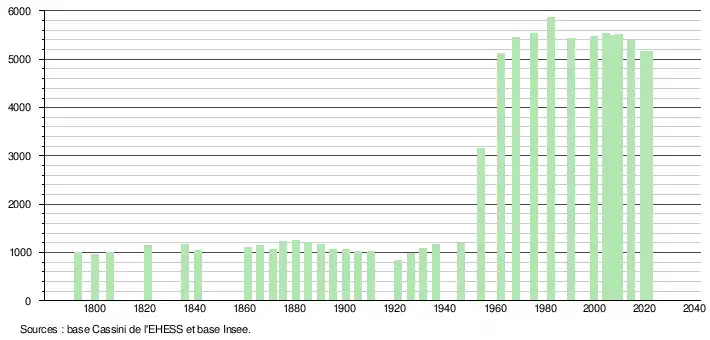 L'évolution du nombre d'habitants est connue à travers les recensements de la population effectués dans la commune depuis 1793. Pour les communes de moins de 10 000 habitants, une enquête de recensement portant sur toute la population est réalisée tous les cinq ans, les populations légales des années intermédiaires étant quant à elles estimées par interpolation ou extrapolation[34]. Pour la commune, le premier recensement exhaustif entrant dans le cadre du nouveau dispositif a été réalisé en 2004[35].